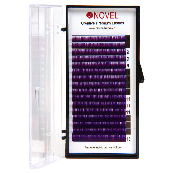 Цветные ресницы Novel Creative выпускаются в оптимальных вариантах изгиба В, С и D, толщиной 0.07, 0.10 и 0.15.